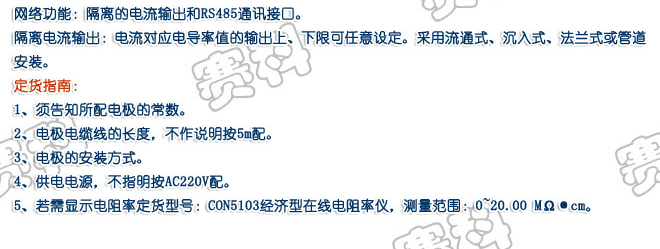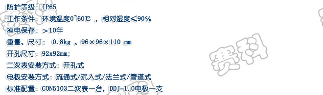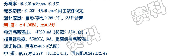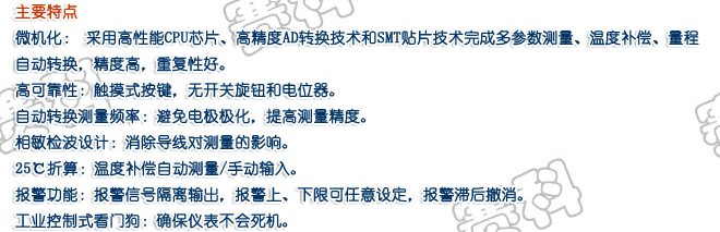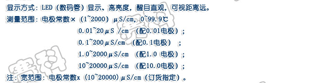 產(chǎn)品概述:產(chǎn)品描述:測量范圍:電極常數(shù)×(1~2000)μS/cm,0~99.9℃;分辨率:0.001μS/cm、0.1℃;精 度:±1.0%FS,±0.3℃;可廣泛應(yīng)用于火電、化工化肥、冶金、環(huán)保、制藥、生化、食品和自來水等溶液中電導(dǎo)率值的連續(xù)監(jiān)測。