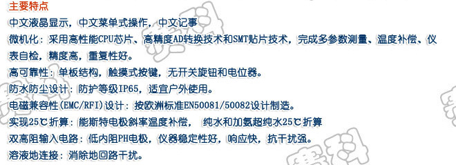產(chǎn)品概述:產(chǎn)品描述: 測量范圍:-2~16.00pH,-1999~+1999mV,0~99.9℃;分 辨 率:0.01pH,0.1mV,0.1℃; 精 度:±0.02pH,±0.5mV,±0.3℃;可廣泛應(yīng)用于火電、化工化肥、冶金、環(huán)保、制藥、生化、食品和自來水等溶液中pH值的連。