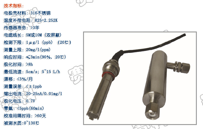 產(chǎn)品概述:電極殼材料:316不銹鋼;測(cè)量上限:20mg/l(ppm);響應(yīng)時(shí)間:≤3min(90%,20℃);測(cè)量誤差: