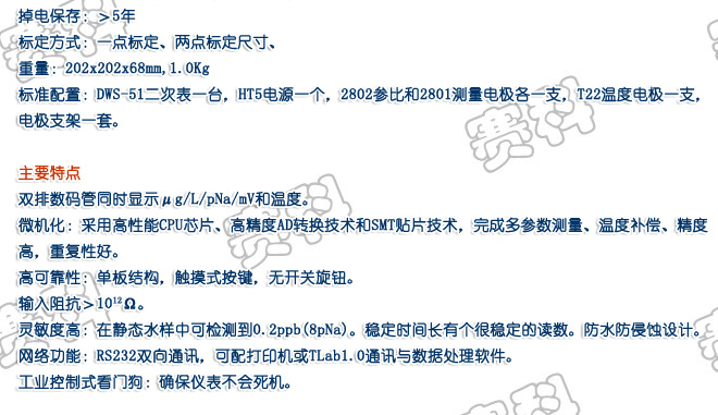 產(chǎn)品概述:測(cè)量范圍:0.2ug/L~23000mg/L,0.00Pa~8.00Pa,-1999~+1999 mV,0~99.9℃;精度:讀數(shù)的±2.5%,±0.2 mV,±0.3℃;應(yīng)用于:火電、化工化肥、冶金、環(huán)保、制藥、生化、食品和自來(lái)水等溶液中鈉離子的連續(xù)監(jiān)測(cè)。
